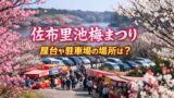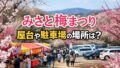 屋台は観梅道沿いや梅資料館周辺に出店し、駐車場は有料(700円前後)と無料があり、混雑を避けるなら平日か午前10時までの到着がベストです!